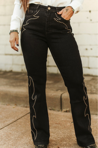 Elevate your denim game with these high-rise black boot stitch bootcut jeans, crafted exclusively for the modern cowgirl. Featuring bold Western-in...