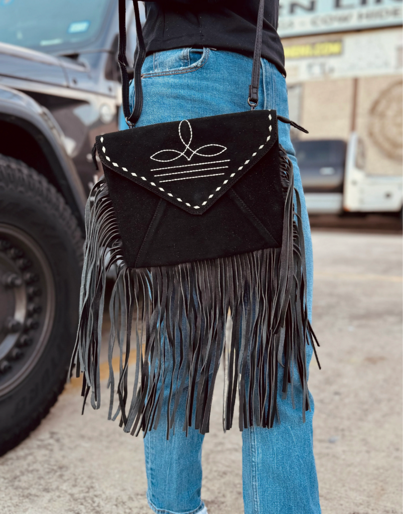 BLACK SUEDE LEATHER BOOTSTITCH FRINGE CROSSBODY